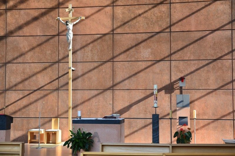 An der Altarwand befindet sich als einzige figürliche Darstellung ein einfaches Kreuz, dessen Korpus von einem ehemaligen Wegkreuz aus der sorbischen Oberlausitz stammte und ein Geschenk der Pfarrei Nebelschütz war.
