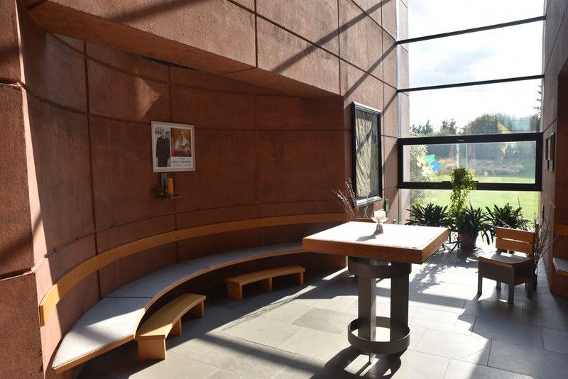 Die Wochentagskapelle gegenüber dem Seiteneingang hat einen runden Grundriss mit halbreisförmigen Sitzbänken um den Altar, welcher in der Mitte steht.
